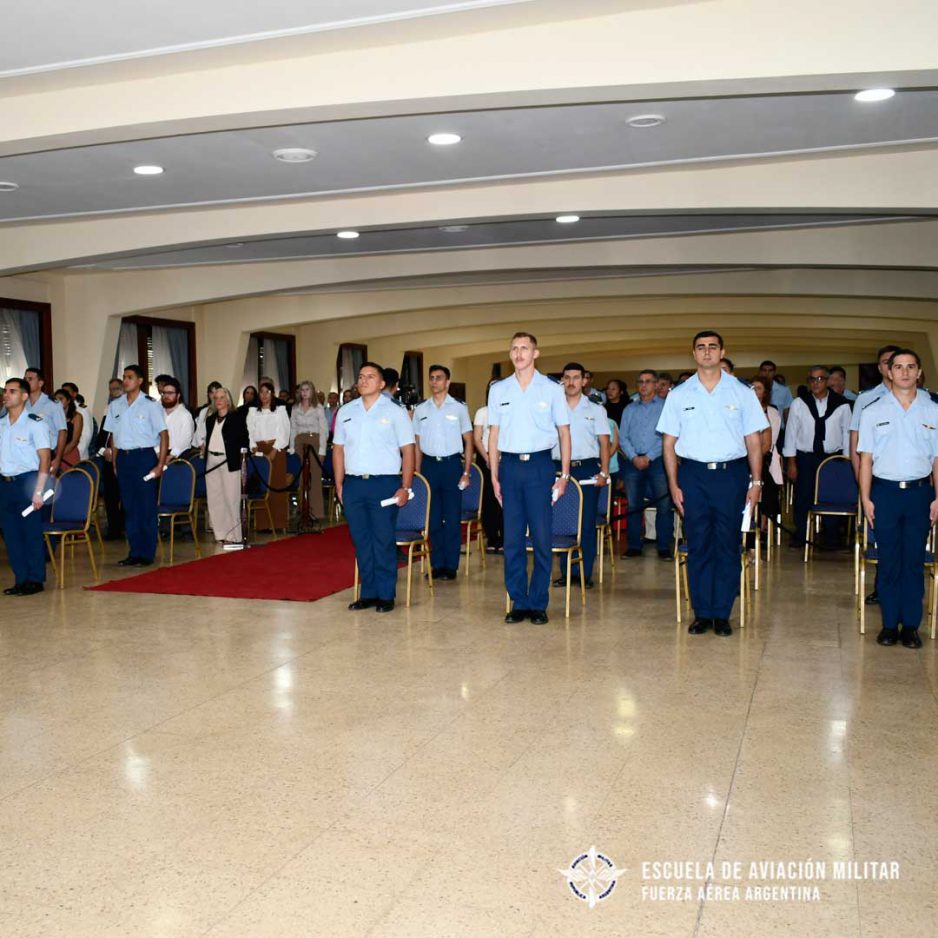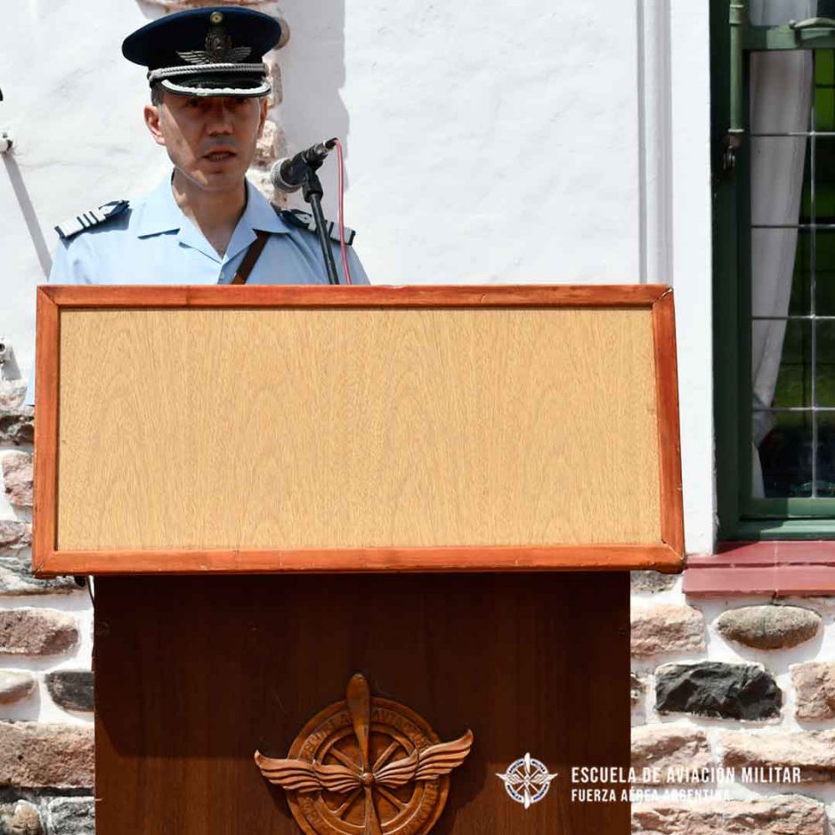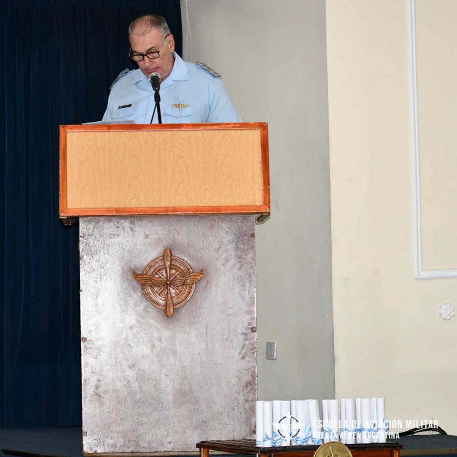 Luego de la invocación religiosa y bendición de despachos impartida por el Capellán de la Escuela de Suboficiales de la Fuerza Aérea Córdoba, Padre Claudio Boffi; el Brigadier Hugo Marcelo Fiocca pronunció un discurso alusivo a tan destacado momento en la carrera de los jóvenes oficiales. “Si bien falta un largo camino por recorrer, hoy han establecido un nuevo hito en sus carreras; posteriormente, continuarán con tensión y dedicación un futuro en donde el adiestramiento les permitirá adquirir las aptitudes y capacidades necesarias como aviadores en sus especialidades avanzadas”.