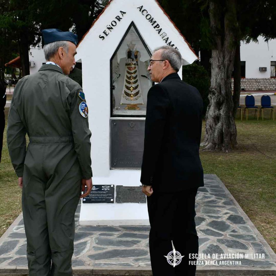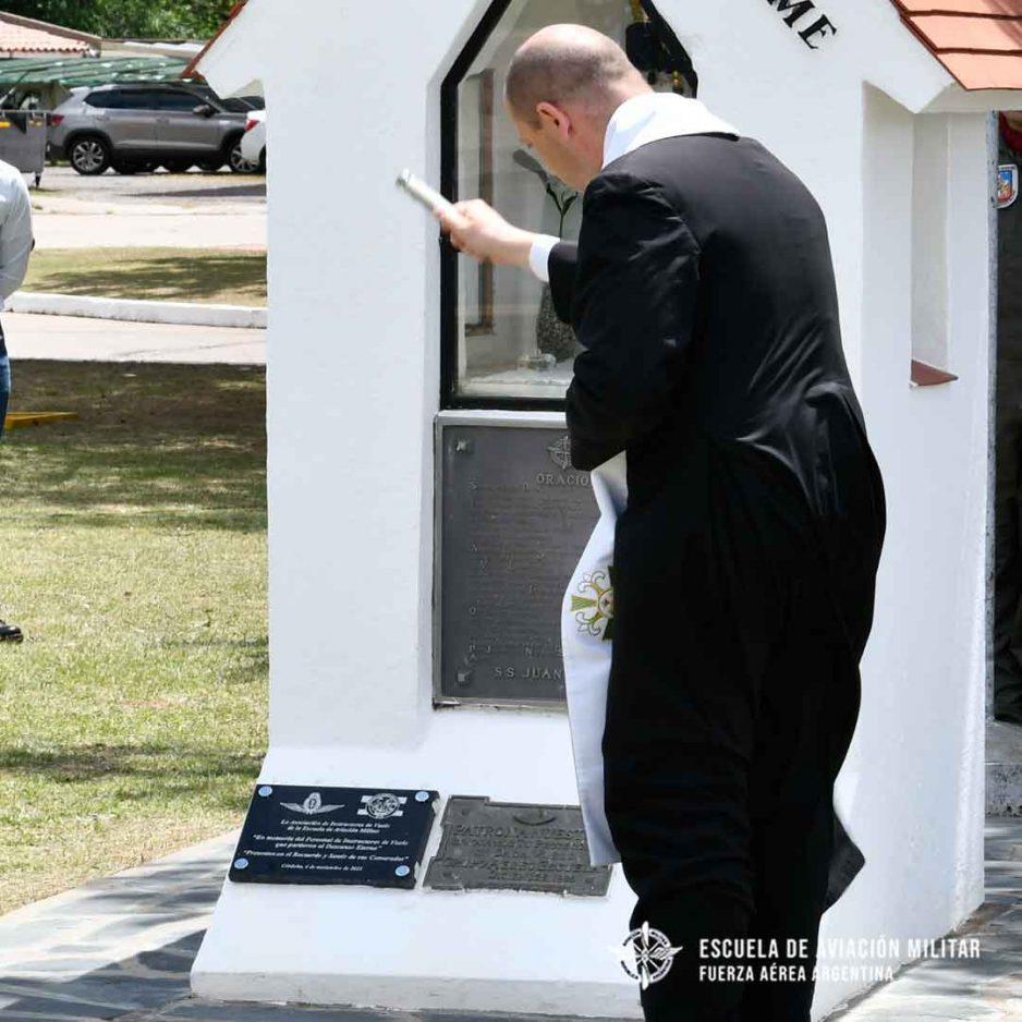 Durante la ceremonia, el Capellán de la Escuela de Aviación Militar, Presbítero Alejandro Salinas, realizó la bendición de la placa y pronunció una oración de responso por el alma de los instructores de vuelo fallecidos y luego se efectuó un toque de silencio en su memoria.
