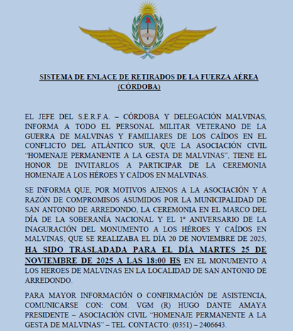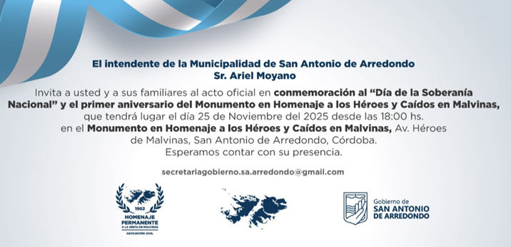 Ceremonia Homenaje a los Héroes y Caídos en Malvinas – San Antonio de Arredondo, SE TRASLADO para el día martes 25 de noviembre de 2025 a las 18:00 hs.