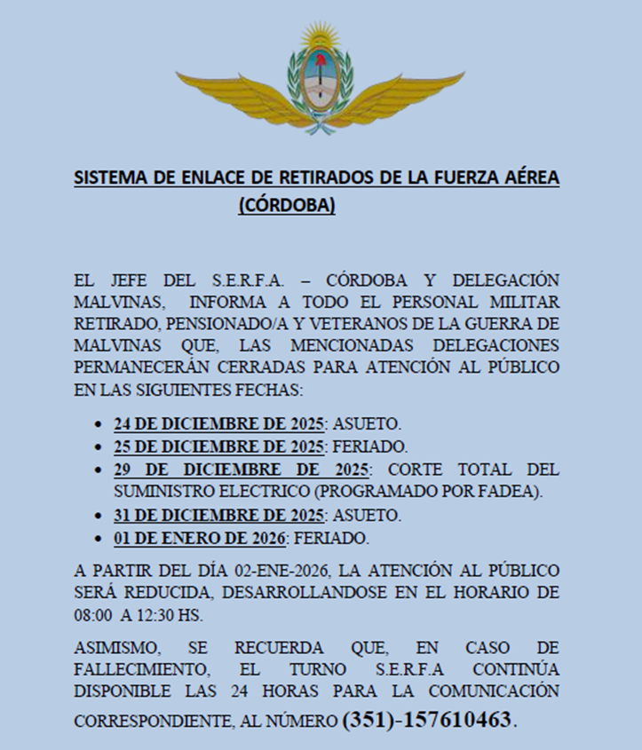 Fechas sin Atención al Público en Delegación S.E.R.F.A Córdoba y Delegación Malvinas. by Nicolas BONO